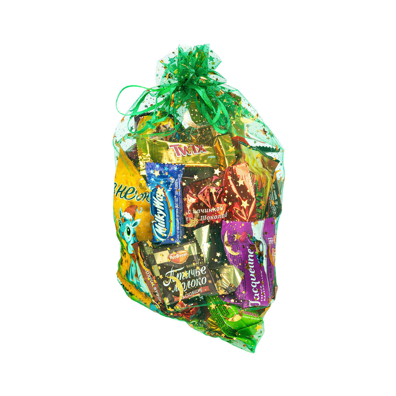 Новогодние сладкие подарки в текстильном мешочке - универсальный выбор, если речь идет о новогоднем празднике в школе или детском саду. “Лунная ночь” - это компактный бюджетный подарочный набор, упакованный в зеленый текстильный мешочек, сверху надежно перевязанный веревочкой. В состав подарка входит входит 500 грамм разнообразных кондитерских изделий на любой вкус: желе, бисквиты, батончки, шоколадные конфеты и многое другое. Также в мешочке можно найти небольшой памятный сувенир в виде символа наступающего года - очаровательной грациозной лошадки.