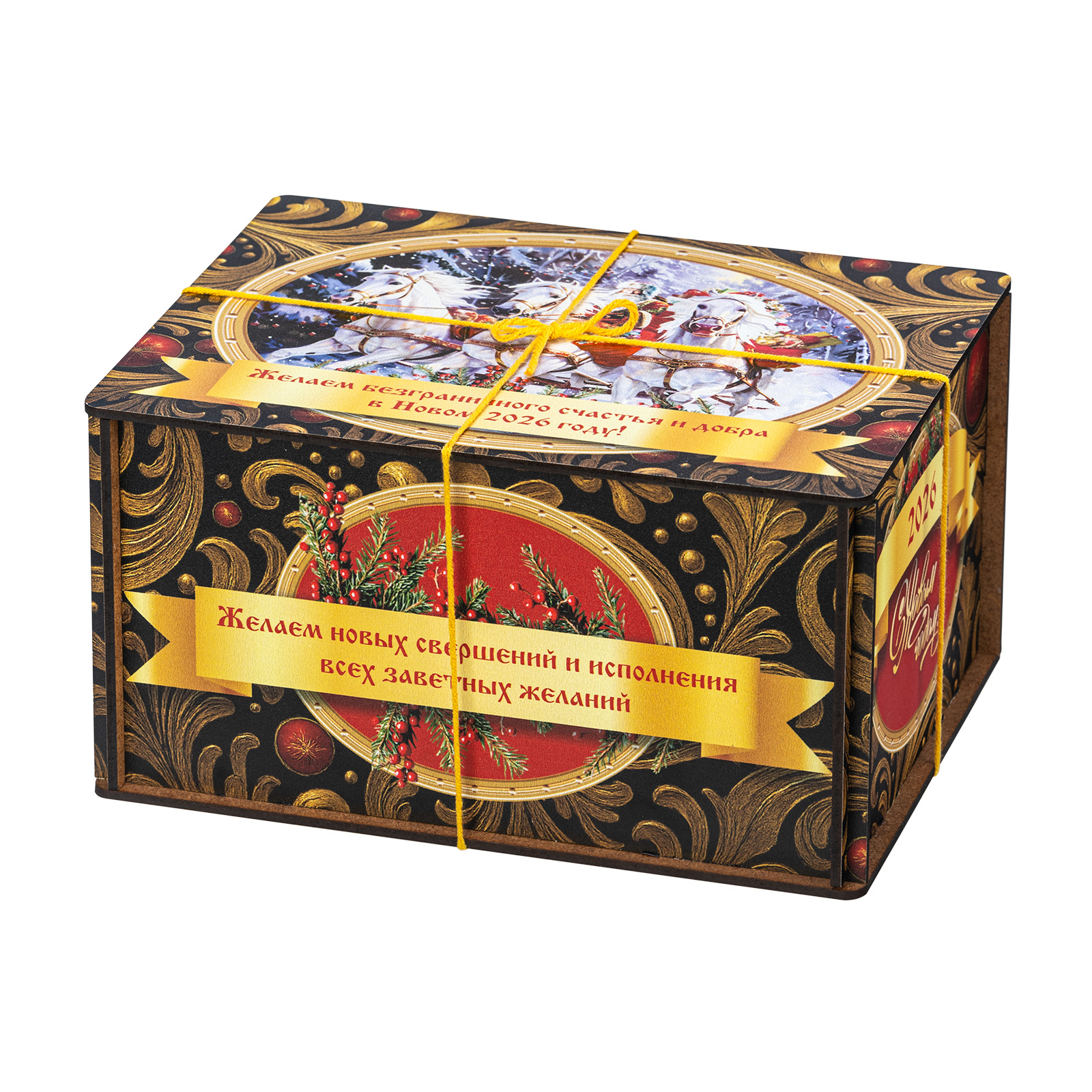 Ищете новогодний сладкий подарок для взрослого сластены? Тогда набор “Посылка Черный бархат” - это то, что вам нужно! В его состав входит целых полтора килограмма разнообразных отборных сладостей на любой вкус! В нем есть шоколадные конфеты с самыми разнообразными начинками, батончики, печенье, халва, а также многие другие любимые лакомства. Кроме сладкого наполнения, в состав подарка входит небольшой памятный сувенир в виде символа наступающего года. Все это бережно упаковано в празднично украшенный деревянный ящичек, перетянутой ярко-желтой ручкой-шнурком. Прям настоящая волшебная посылка!