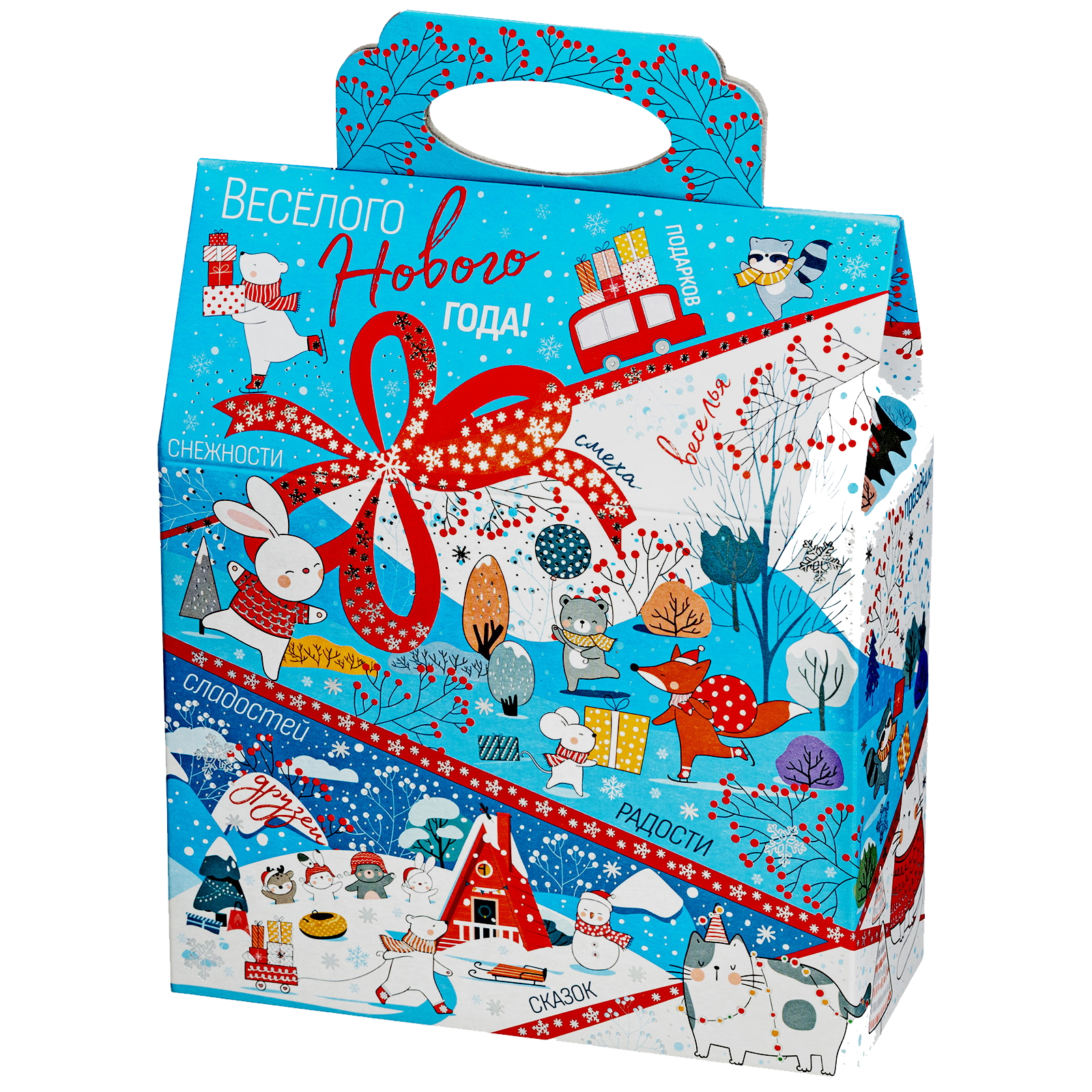Новогодние сладкие подарки в картонной упаковке - это универсальный выбор для праздника в детском учреждении или корпоратива в крупной компании. Набор “Синее небо” - это небольшой, но безумно приятный сладкий подарок, которому порадуется сластена любого возраста. Подарочная упаковка представляет собой небольшую картонную сумочку нежно-голубого цвета. Со всех сторон она украшена разнообразными забавными иллюстрациями, на который веселые зверята уже во всю погрузились в предновогодние хлопоты. Помимо привлекательной упаковки подарок может порадовать разнообразным сладким наполнением, в котором каждый сможет найти себе лакомство по вкусу!